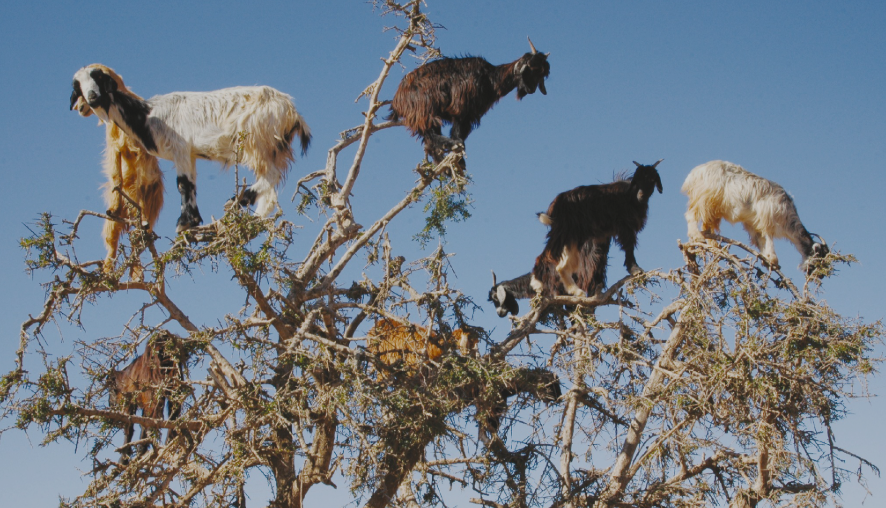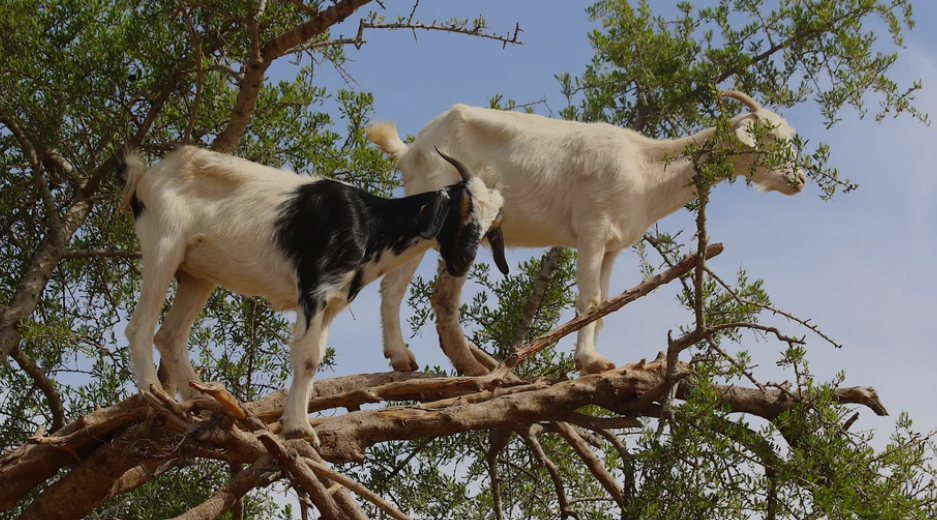 Moroccan Argan goats, native to the arid southwestern regions of Morocco, are renowned for their remarkable ability to climb argan trees in search of ripe fruit. These hardy animals, often simply referred to as Moroccan goats, have adapted to the scarce vegetation of the Souss Valley by scaling thorny branches up to 10 meters high, balancing precariously on slender limbs to reach the nutritious argan nuts.