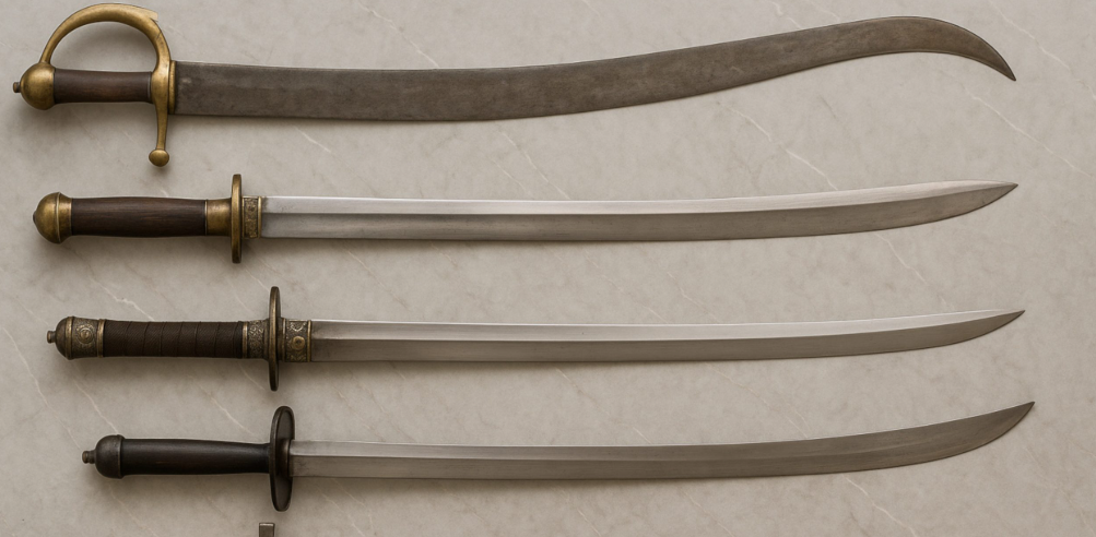 The cutlass is a short curved naval sword with a single-edged blade 24-30 inches long designed for close-quarters combat aboard ships. This sailor’s weapon featured a short blade ideal for fighting in confined shipboard spaces and a sturdy construction for hacking through rigging. Cutlasses were standard naval weapons used in boarding actions and ship defense, emphasizing chopping attacks effective in cramped conditions.