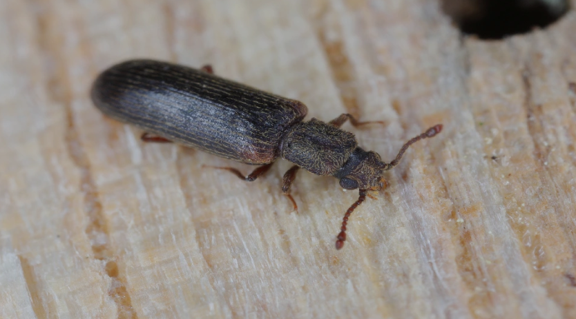 This small beetle primarily attacks hardwoods, including oak, ash, and mahogany. Its larvae tunnel through the sapwood, reducing it to a fine powder known as frass. Infestations can damage furniture, flooring, and structural wood, making early detection important.