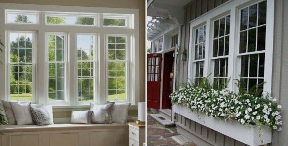 A garden window projects outward from the wall and typically includes glass panels on all sides. It creates a small shelf-like space often used for growing plants indoors. These windows are popular in kitchens because they allow sunlight to reach herbs and decorative plants.